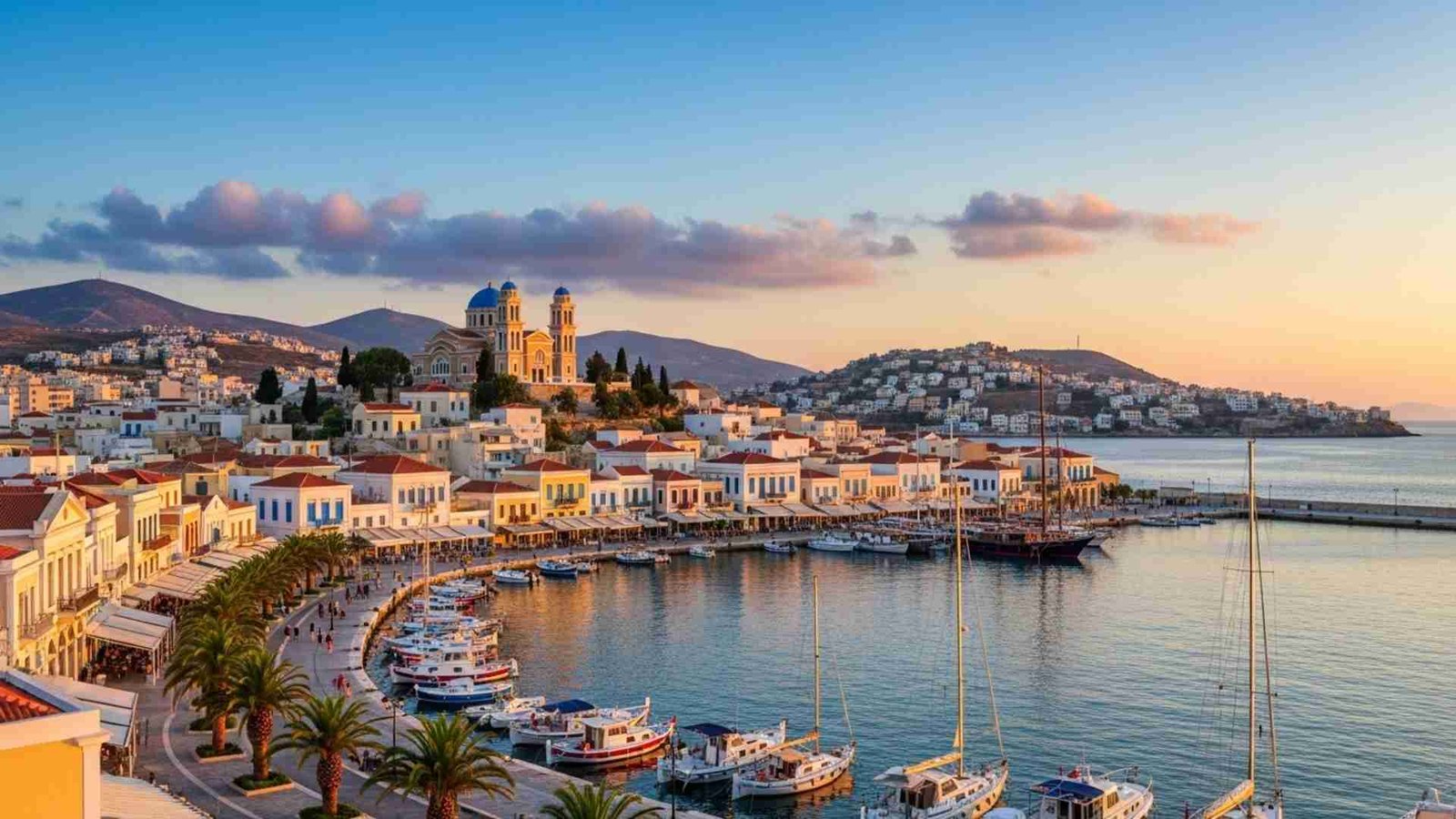 you arrive by ferry from Athens in the evening. Waves slap the quay, lights reflect in the water, voices echo in the square. You don’t head to the beach first. Instead you stroll the marble-paved streets of Ermoupoli, grab a coffee at the café inside the Town Hall (yes, you read that right—there’s a café inside) and absorb the feeling of a living town, not just a resort.